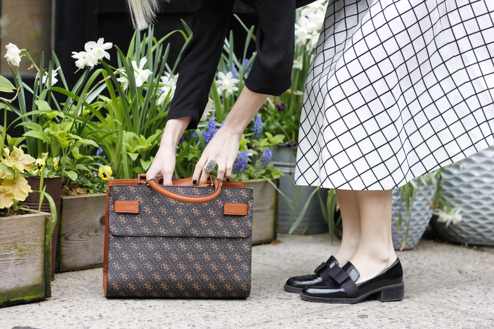 Happy Monday Lovelies, I had a CRAZY Weekend..but crazy in a good way! Besides fashion I enjoy going to festivals and meeting people while dancing to some amazing edm songs. Even though I lost my phone (which is really upsetting) I couldn't allow that to stop me from having the best time of my life. However, I am grateful that I had off today so I can relax. Anywho, back to the fashion world. I think anyone who looks at these pictures gets the "American Girl" feeling. What I wanted to show off in this post was that a girl can go to work looking professional but chic at the same time. Girls, we know what's professional and what's not. Therefore, by wearing a simple blouse and slacks is not style. Maybe sometimes we can pull this off but not 24/7. I am wearing this gorgeous black and white monochrome skirt from Minan Wong. This midi skirt gives it a flirty feeling but it definitely screams classy. Then, I decided to tuck in this light silk black blouse so the two pieces together can give it a sharp enough look for the office-wear. Instead of putting on heels I decided to wear these very comfy loafers that I have from Zara. However, if you're the type of girl who enjoys wearing work-attire heels while working go ahead because this outfit will allow you to change up your shoes all day. You can wear flats or loafers and then you can put your work-heels on. I love this satchel from Guess. This is a on-the-go satchel, it provides you with more than enough space to place your daily must take with you essentials. No space to complain for. I hope that everyone enjoyed their Monday! :)